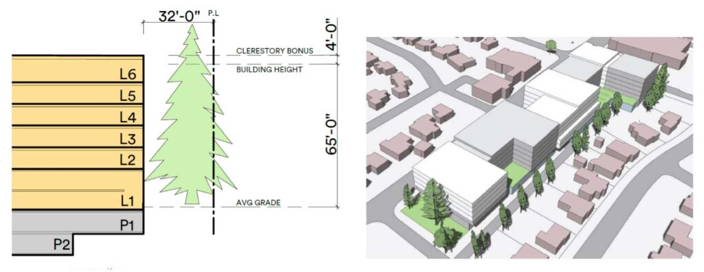 Security Properties will be requesting that the City of Seattle NE Design Review Board approve a departure to adopt the preferred building massing with the tree preservation setbacks and an additional 10-feet of height. The City of Seattle does allow for this departure if approved by the Design Review Board.